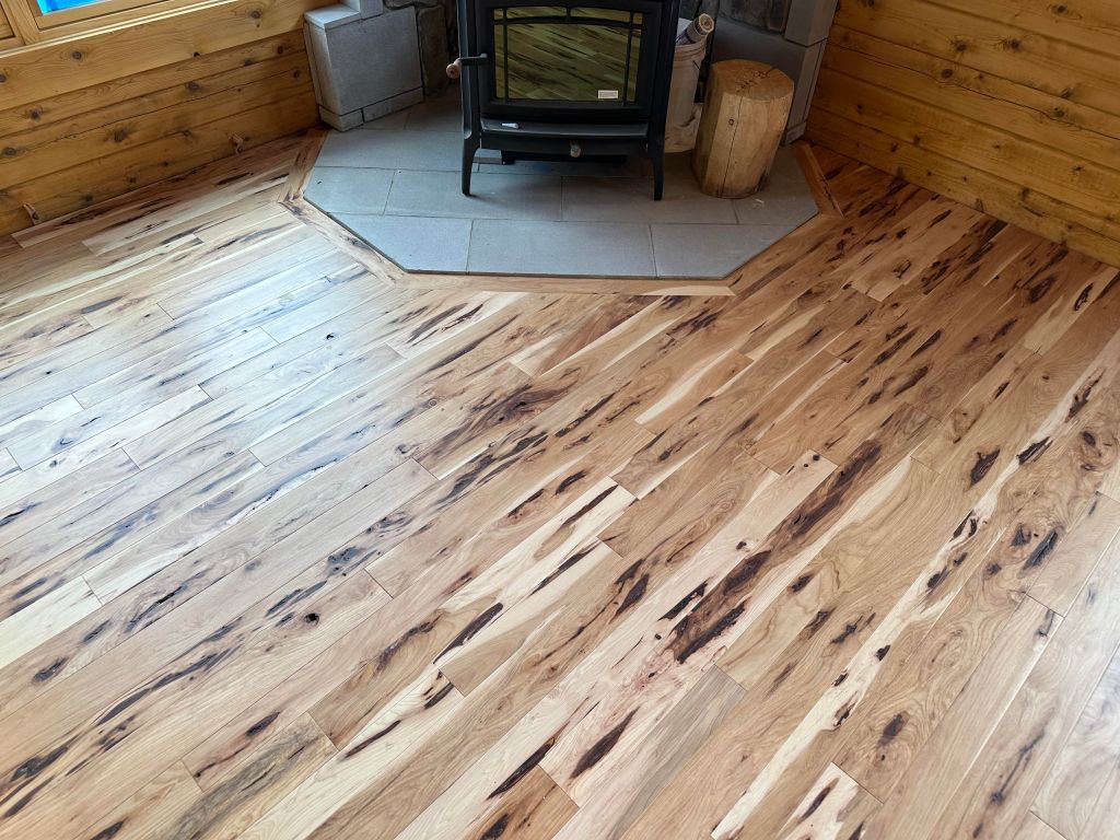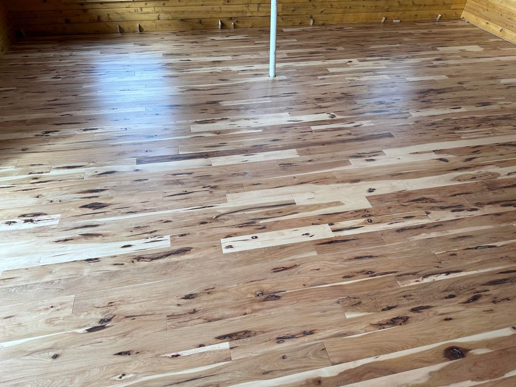 OUR CUSTOMER CHOSE OUR PREFINISHED 3 1/4″ AND 4 1/4″ BARK HICKORY IN A RANDOM WIDTH IN OUR 10 SHEEN FINISH.